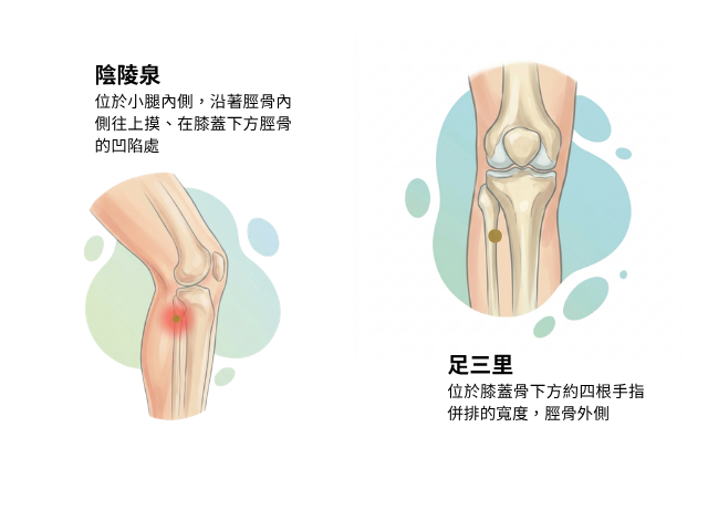 - 找法:膝蓋彎曲,手摸膝蓋內側,找到突起的骨頭(脛骨內側髁),往下滑一點,會摸到一個明顯凹陷、按壓有點痠的點,這裡就是陰陵泉。